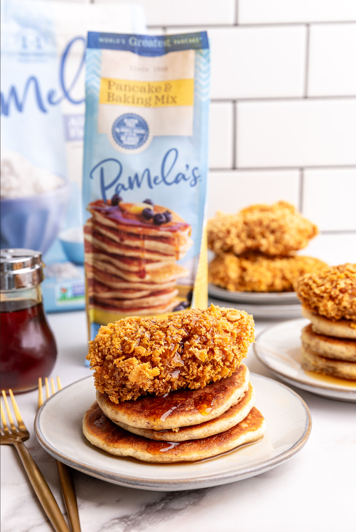 Serve the chicken over a stack of 3 pancakes. Drizzle with maple syrup.