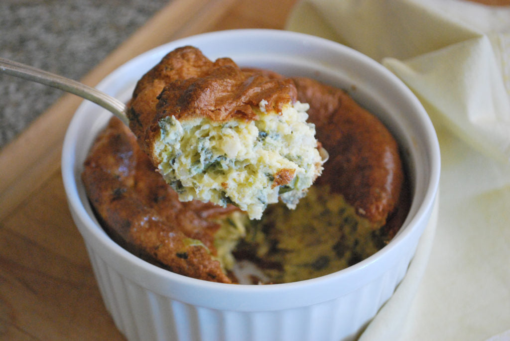 Lightly steamed and chopped asparagus, spinach or broccoli can be used instead of Swiss chard. The soufflé can also be made with no vegetables but baking time would be reduced to about 40 minutes.