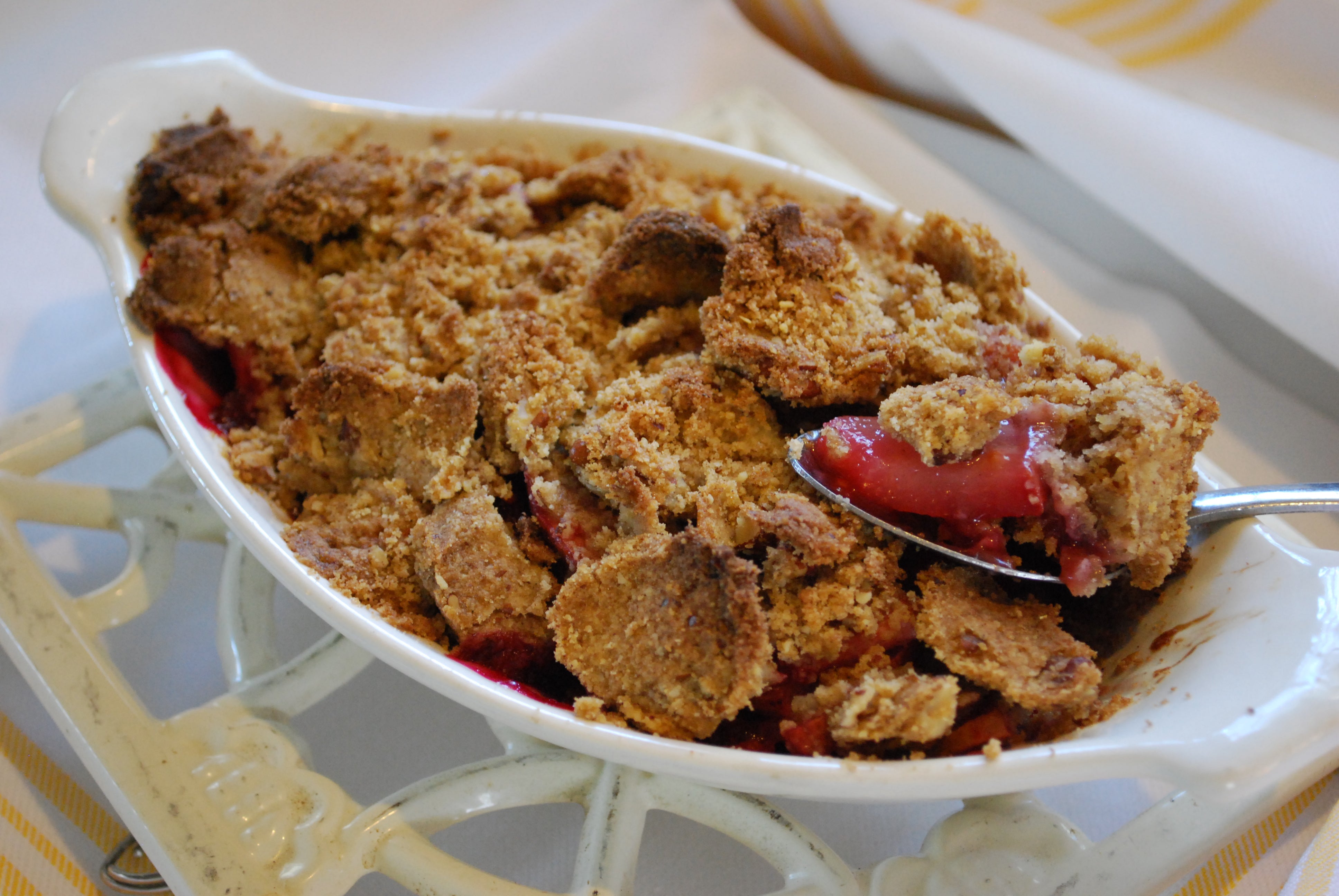 Bake in a 350° oven for about 30 minutes, or until crumble looks browned on top and fruit is cooked.