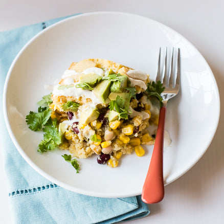 Pour the batter evenly over the filling making sure to get it all the way to the edges. Place in oven and bake for 30-35 minutes. The cornbread crust will be golden and cooked through, and the filling bubbling around the edges. Test for doneness by inserting a toothpick just into the cornbread. If it comes out clean, the tamale pie is done.