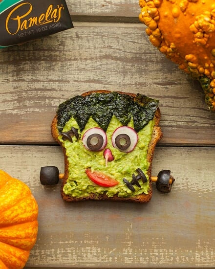 Create a gluten-free monster with this fun Frankenstein Toast! It's a tasty, healthy snack that doubles as a creative activity. Recipe + photo by Pinch My Salt.