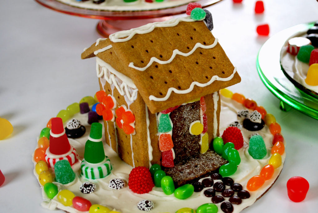 Allow the whole thing to dry before adding the roof. Run a bead of frosting around the tops of all four walls. Add beads of frosting to the tops of the two end triangles and place opposite each other. Now add one roof piece, nestling it into the frosting on top of the triangles, add the second roof piece, and gently press into the frosting. Now add a generous bead of frosting where the two roof pieces come together on top, to hold the ridgeline together. Use some jujubes or mini M & Ms to decorate.