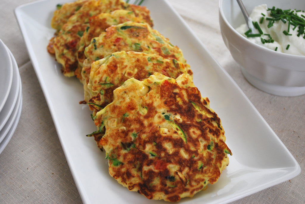Add 1 TBSP olive oil and 1 TBSP butter to non-stick pan and fry heaping tablespoons of batter on medium heat, pressing the batter to flatten the pancakes. Cook until slightly browned on the bottom and bubbles are forming on top. Flip and cook until second side is slightly browned and pancakes are cooked all the way through. Eat plain, or top with Greek yogurt and chives, or smoked salmon or prosciutto.