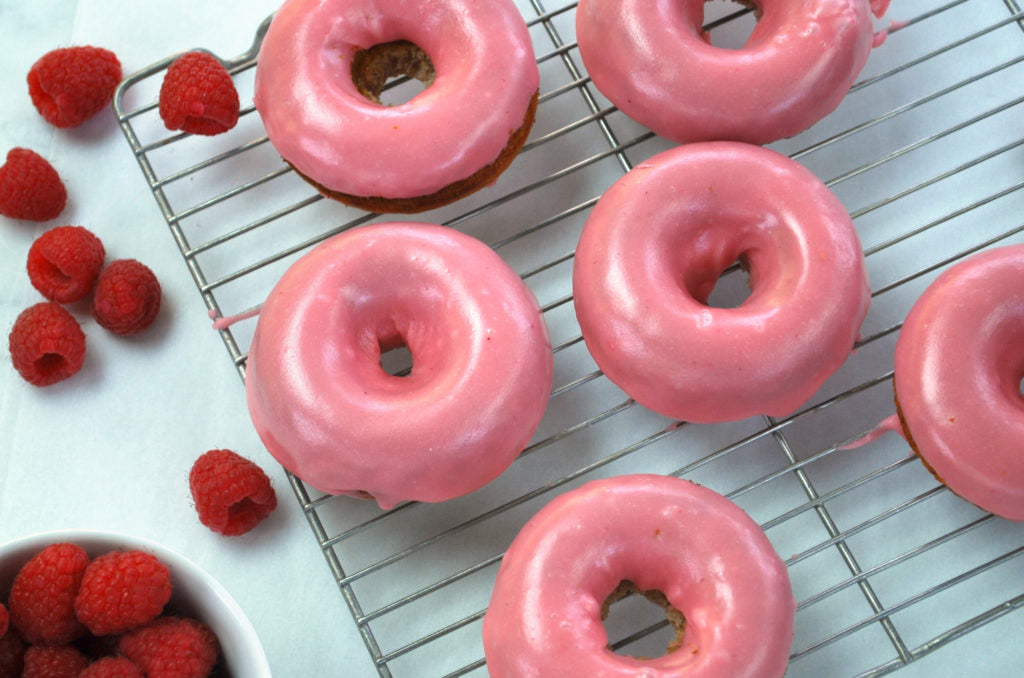 Blend or process raspberries until smooth puree forms. Strain seeds from puree with fine strainer or food mill. Add 2 TBSP sugar and mix well. Divide puree: ¾ cup for donuts and ¼ cup for glaze or ganache.